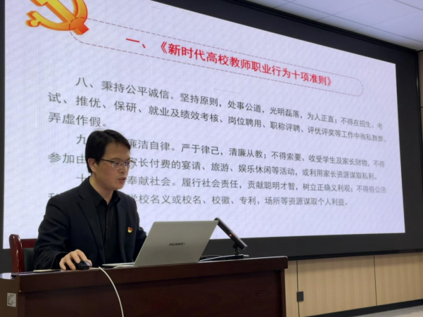 学习活动分两大板块有序开展。在文件学习环节,学院总支副书记李祥林带领全体教职工系统学习了教育部《关于高校教师师德失范行为处理的指导意见》、《新时代高校教师职业行为十项准则》以及《湖南省高校教师违反职业道德行为处理实施办法》等重要文件。通过原文解读、案例分析、交流讨论等形式,教职工们深入领会文件精神实质,清晰掌握高校教师在职业行为中的红线与底线,深刻认识到师德师风是教师队伍建设的灵魂,而党风廉政建设则是保障教育事业健康发展的重要基石。
