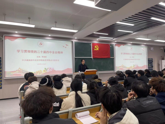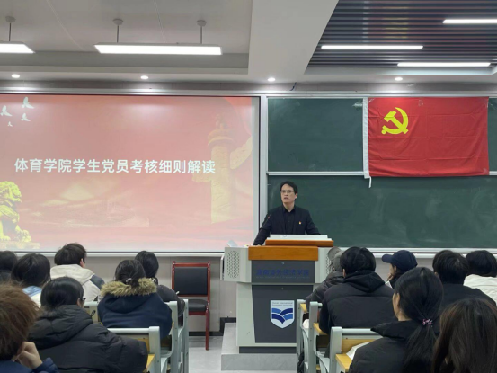 2025年11月19日12时,体育学院在四教104教室召开学生党员考核细则解读暨 “七个一”工程建设推进大会。学院党员先锋队干部、全体入党培养对象参会,大会由体育学院党总支副书记李祥林主讲,以学习贯彻党的二十届四中全会精神为重要导向,紧扣习近平新时代中国特色社会主义思想和党的二十大精神,为学生党员培养管理工作锚定方向。