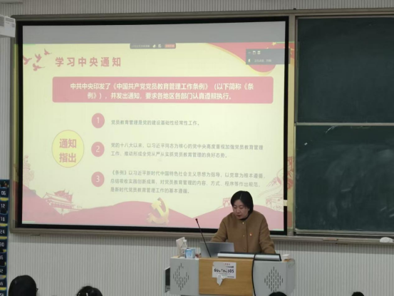 为进一步加强党员教育管理工作,提升党组织的凝聚力和战斗力,体育学院院于11月20日19:00-20:30开展了第20期预备党员培训主题党课,集中学习了《中国共产党党员教育管理工作条例》,本次党课由党委组织部徐莲静老师主讲,全体预备党员参加了学习。