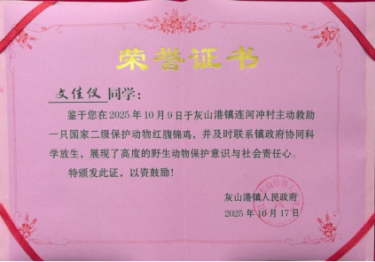 此次文佳仪成功救助红腹锦鸡的事件,不仅展现了本院学子扎实的生态保护知识储备与强烈的社会责任感,更印证了学校生态文明教育的实效。未来,体育学院将继续深化生态教育内涵,通过更多元的活动与课程,鼓励更多学生成为野生动物保护的“践行者”与“宣传员”,用青春力量为生物多样性保护注入更多动能。