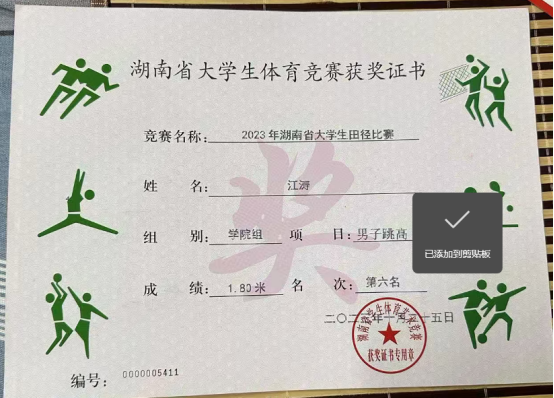 江涛于2023年考入我校体育学院,就读于社会体育指导与管理专业2329班。入学伊始,其出色的身体素质和运动天赋便崭露头角。在2023年学校田径运动会上,他一人独揽男子跳远、跳高两项冠军。同年,在竞争激烈的湖南省大学生田径比赛中,他更是力挫群雄,夺得男子跳高第六名、男子跳远第七名,并与队友协力拿下男子4×100米接力第八名。赛场上的他,是速度、力量与高度的完美结合,展现了体院学子顽强拼搏、追求卓越的精神风貌。这些经历,不仅为他打下了坚实的体能基础,更锤炼了他不畏强手、敢于争先的意志品质。