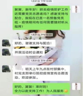 来自社体 1805 班的付煌耀(入党积极分子,班长,湖南岳阳平江县汉昌镇城西志愿者)在了解到村支部需要对抗疫情的志愿者时,尽管家人有所担心和忧虑, 他依然向村支部提出申请,坚持为家乡做出一份贡献。他说:“虽然每天的工作很多,会有些繁重,并且存在一定的困难,但当看到人们对疫情的重视度越来越高、积极配合的人和踊跃参加到志愿者队伍中的人越来越多时,我感受到我的奉献是值得的。”