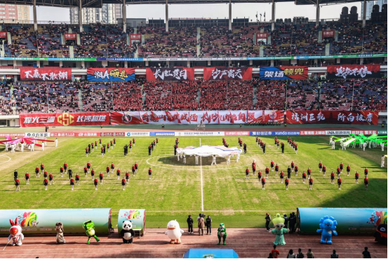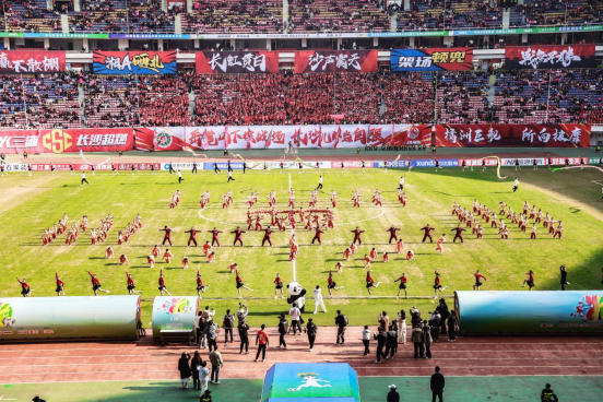 作为由湖南省人民政府指导,省体育局、省教育厅、省文化和旅游厅、湖南广播电视台联合主办的重要赛事,湘超联赛不仅是体育竞技的平台,也成为展示高校学子风采的窗口。湖南涉外经济学院体育学院的学子们身着统一表演服装,以整齐有力的动作、饱满的热情和富有创意的队形设计,完美演绎了青春活力与体育精神的融合。演出中还巧妙运用巨型足球道具,突出足球主题,赢得现场观众阵阵掌声。