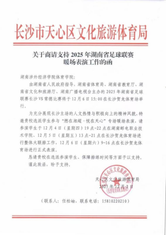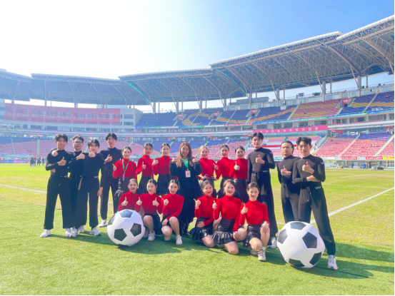 2025年12月6日,湖南省足球联赛长沙对阵常德的比赛在长沙贺龙体育场举行。受活动主办方邀请,我校体育学院表演系学子参与了本次“燃在湘超,悦在天心”专场暖场演出,以专业表演助力营造主场氛围,展现了涉外学子昂扬向上的精神风貌。