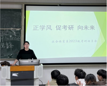 为深化学风建设工作,精准引导2023级学生明晰学业发展方向,近日,社会体育系于六教113召开2023级“正学风·促考研·向未来”考研动员大会。社会体育系主任徐晓琴,教师代表宋靓雯、肖瑶,党总支副书记李祥林,2023级年级长贺双姣参会,为学子备考与学业发展答疑解惑、明晰发展方向。