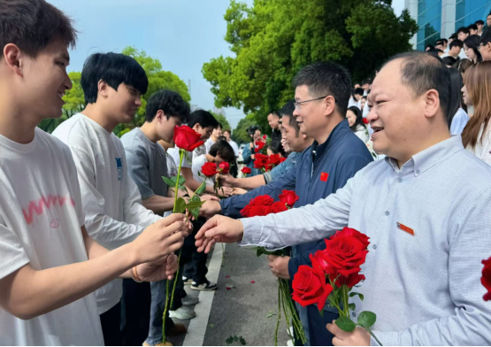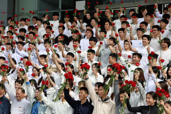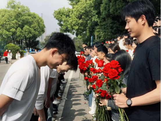 在“祝福礼”环节,各位老师亲手将娇艳的红玫瑰赠予每一位毕业生,鲜红的玫瑰承载着师长的祝福与期许,寓意着毕业生们前程似锦、一路繁花。手中的鲜花不仅是离别时的美好馈赠,更是师生情谊的温暖见证。