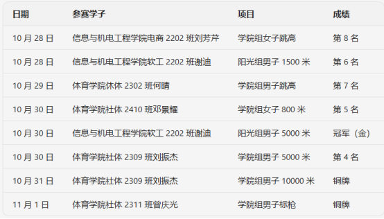 2025年10月28日至11月1日,2025年湖南省大学生田径运动会在湖南科技大学田径场圆满落幕。本次赛事由湖南省教育厅主办、湖南科技大学承办,作为全省高校体育领域的重要赛事,共吸引来自全省96个单位的1180余名运动员参赛,赛事规模与竞技水平均创近年新高。我校高度重视此次赛事,组建了由10名学子组成的参赛队伍(体育学院8人、信息与机电工程学院2人),赛前开展系统性专项训练。比赛期间,全体队员秉持我校“至善至美,自立自强”的育人理念,以昂扬姿态挑战极限、驰骋赛场,最终斩获1金2铜及5项赛事排名,累计8项荣誉,充分彰显我校“以体载道、以体育人”的育人成效,为校赢得荣誉。