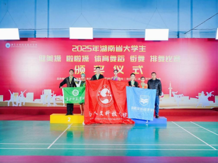 2025年12月1日至4日,由湖南省教育厅主办、湖南工程职业技术学院承办、湖南省学生体育协会协办的2025年湖南省大学生体育舞蹈比赛圆满落幕。本次赛事汇集全省60所高校700多名运动员同台竞技,我校体育舞蹈代表队选派12名学子参赛,以灵动精湛的舞技、浑然天成的默契与朝气蓬勃的斗志,在全省高校强手的同台竞技中崭露头角,一举斩获2金1铜的亮眼战绩,更有9项成果跻身各组别前八,为学校赢得荣誉。